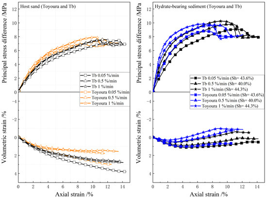 Figure 4 shows the stress–strain relationship of the hydrate-bearing sediments (Toyoura and Tb) and the host sand (Toyoura and Tb). As can be seen in the left portion of Figure 4, the presence of fine particles reduced the initial stiffness and facilitated the volume compression behavior of host Tb sand. Volumetric compression was found to be most significant at a strain rate of 0.05%/min, consistent with the results obtained for the host Toyoura sand. The right portion of Figure 4 compared the stress–strain behavior of hydrate-bearing sediments (Toyoura and Tb) with a high hydrate saturation. The stress–strain behavior of hydrate-bearing sediments with fine particles also has strong strain rate dependence; however, under the same strain rate conditions, the presence of fine particles reduces the initial stiffness and volume expansion effect of the hydrate-bearing sediments.