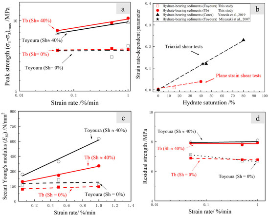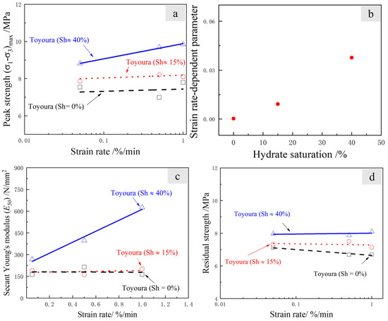 Variation in (a) the peak strength, (b) the strain rate-dependent parameter, (c) the secant Young’s modulus (E50), and (d) the residual strength of hydrate-bearing sediments and host Toyoura sand at different strain rates.