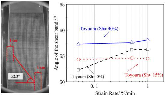 Figure 6 shows the schematic diagram of the shear band angle measurement method and the shear band angle results of hydrate-bearing sediments and host Toyoura sand at different strain rates. For host Toyoura sand, the angle of the shear band increases significantly when the strain rate changes from 0.05%/min to 0.5%/min. For the hydrate-bearing sediments with a low hydrate saturation, the strain rate has no effect on the shear band angle, and when the strain rate is greater than 0.05%/min, the shear band angle of the hydrate-bearing sediments is smaller than that of the host Toyoura sand. In the hydrate-bearing sediments with a high hydrate saturation, the angle of the shear band increases significantly, but the strain rate also has no significant effect on it. This implies that when the sediment contains hydrate, the angle of the shear band is independent of the strain rate; however, the hydrate saturation and the shear band angle of the sediments cannot be simply described by a positive correlation because they may have opposite laws under different strain rates.