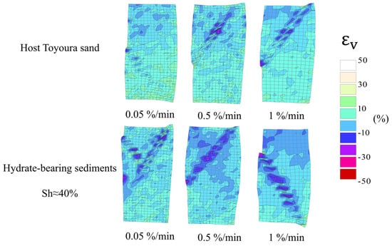 The volumetric strain behavior of hydrate-bearing sediments with low hydrate saturation is similar to that of host Toyoura sand (see Figure 3). Figure 7 only shows the contours of the volumetric strain of hydrate-bearing sediments with a high hydrate saturation and host Toyoura sand at the critical state stage [38]. Compared with the host Toyoura sand, the hydrate-bearing sediments with a high hydrate saturation have more significant local volume expansion with the increase in strain rate. This is consistent with the result in Figure 5 that the volume expansion of hydrate-bearing sediments with high hydrate saturation is more pronounced with increasing strain rate. Yoneda et al. (2016) found that the movement of sediment particles can compress as well as dilate the sample in the shear band area, and the particle structure changes in the shear band position were much more significant than those in the non-shear band position [39]. The presence of hydrates makes the sediment more compact, and the relatively fast movement of sediment particles may tend to dilate the sample under high strain rate conditions.