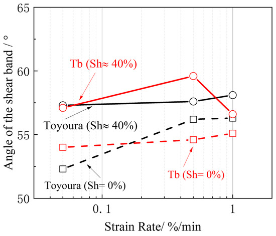 The shear band angle results of hydrate-bearing sediments (Toyoura and Tb) and host sand (Toyoura and Tb) at different strain rates.