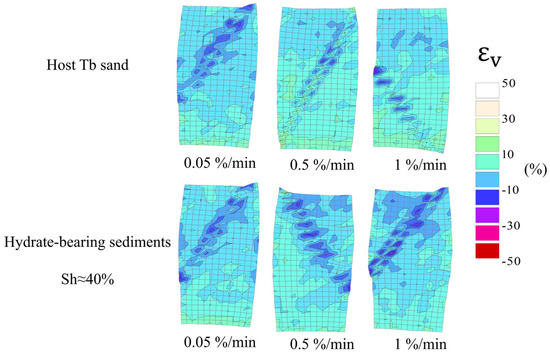 The contours of the volumetric strain of hydrate-bearing sediments and host Tb sand at the critical state stage are shown in Figure 10. Compared to the result of host Toyoura and hydrate-bearing sediments (Toyoura) in Figure 7, under a higher strain rate, the local volumetric expansion area of the host sand (Tb) and hydrate-bearing sediments (Tb) is slightly reduced and increased, respectively. This means that the strain rate has little effect on the local volumetric strain of the samples (Tb), regardless of hydrate presence. Additionally, the local volumetric strain expansion of the hydrate-bearing sediments (Toyoura) is more significant than that of the hydrate-bearing sediments (Tb) under all strain rate conditions.