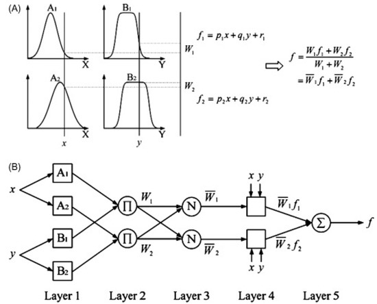 Description of the ANFIS method: (A) fuzzy inference and (B) corresponding ANFIS structure.