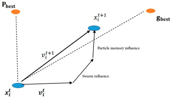 The relative simplicity of the process with only two equations is one of the main advantages of PSO over many other optimization techniques (i.e., the equation of motion and the equation for updating the velocity). The actual motion of the particles is determined via their unique velocity vector, which is used in the first equation. Conversely, the second determines how the velocity vector must shift to account for the presence of opposing forces [46,47]. The convergence rate of the PSO algorithm is further improved by introducing the inertia weight (w) (Figure 3).