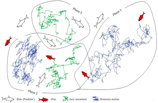 The MPA is a meta-heuristic (MH) algorithm based on the hunting techniques of marine predators. Like the other algorithms of MH, the MPA first explores the search space and obtains random intervals of initial solutions using a prey search technique. The primary structure of the algorithm is that the current position determines the future position of the solution [48,49]. Marine predators use Lévy and Brownian search techniques when searching for food, switching between the two depending on the availability of potential meals. In locations with lower prey concentration, predators use the Lévy movement. Instead, Brownian motion is used [50,51] when numerous potential victims are available. This study randomly chose initial solutions, updating the positions using Equation (4) as follows:
