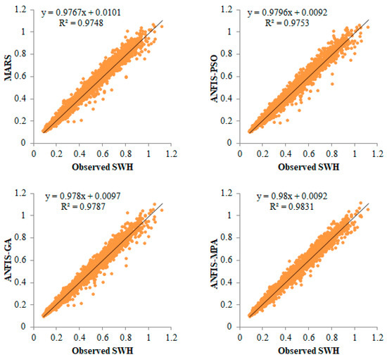 Scatterplots of the observed and predicted SWH by different models in the test period using the best input combination at Station 2.