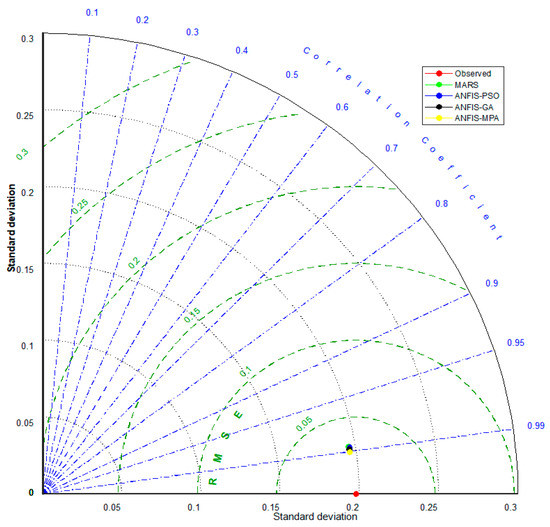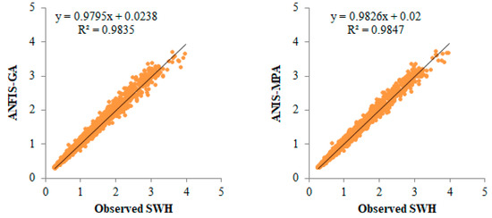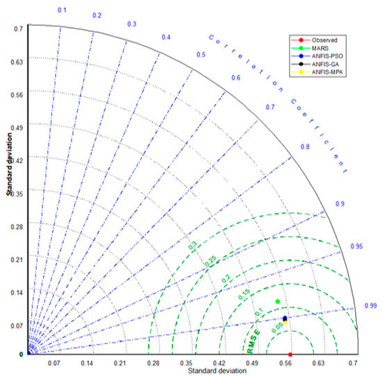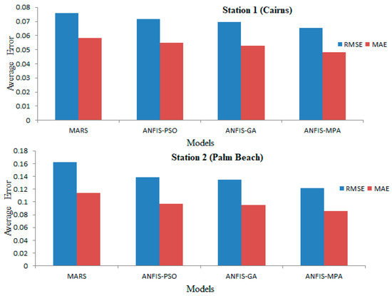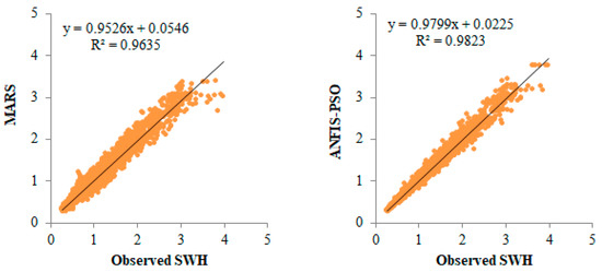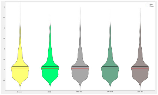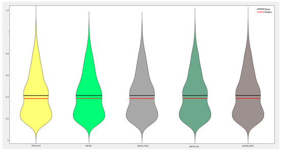The hybrid neuro-fuzzy and MARS models for predicting SWH are compared in Figure 6 and Figure 7 using scatter plots. The MPS-based ANFIS has the least scattered predictions, with the fitting equation closer to the exact line (y = x) and the highest R2 in both stations. The models with three inputs (best models) are compared using Taylor diagrams in Figure 8 and Figure 9. This type of graph is very useful for observing the accuracy of the models based on RMSE, standard deviation, and correlation. The plots show that the MPA-based ANFIS has the highest correlation and the lowest squared error in predicting the SWH of both stations. The violin charts in Figure 10 and Figure 11 compare the SWH predictions and observations distributions. The figures show that the mean, median, and distribution of the MPA-based ANFIS are more like the observed values. Figure 12 illustrates the average RMSE and MAE errors of all implemented models in predicting the SWH of both stations. It is clearly seen from the bar charts that the ANFIS-MPA has fewer RMSE and MAE errors in the short-term prediction of SWH in both sites.