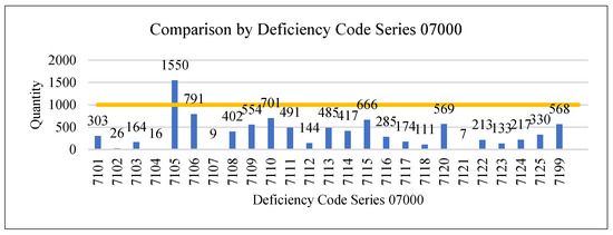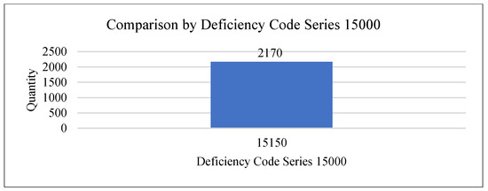 From the database [2], a comparison chart of deficiency codes for each series was obtained. From the chart, we can see that if we compare the series, the series with the highest number of deficiency codes is 18000 (MLC2006, 11177) (Figure 2). If we discuss each series separately, we can see that in 01000 (Certifications and Documentation), 01314 (SOPEP, 915) is the most numerous (Figure A1); in 02000 (structural condition), 02108 (electrical installations seaworthiness, 570) is the most numerous (Figure A2); in 03000 (water/weathertight condition), with 03102 (freeboard marks, 582) the most (Figure A3); in 04000 (emergency systems), with 04103 (emergency, lighting batteries and switches, 840) the most (Figure 3); in 05000 (radio communication), with 05115 (radio log[diary] 321) the most (Figure A4); in 06000 (cargo operations including equipment), with 06105 (atmosphere testing instrument, 129) the most (Figure A5); in 07000 (Fire Safety), with 07105 (fire doors/openings in fire-resisting divisions, 1550) the most (Figure 4); in 08000 (alarms), with 08107 (machinery controls alarm, 239) the most (Figure A6); in 09000 (working and living conditions), with 09232 (cleanliness of engine room, 382) the most (Figure A7); in 10000 (safety of navigation), with 10116 (nautical publications, 828) the most (Figure A8); in 11000 (life-saving appliances), with 11117 (lifebuoys including provision and disposition, 722) the most (Figure A9); in 12000 (dangerous goods), with 12108 (personal protection, 52) the most (Figure A10); in 13000 (propulsion and auxiliary machinery), with 13102 (auxiliary engine, 728) the most (Figure A11); in 14000 (pollution prevention), with 14802 (ballast water record book, 479) the most (Figure A12); in 15000 (ISM), although there is only one deficiency code 15150, but there are many (Figure 5); in 16000 (ISPS), with 16105 (access control to ship, 530) the most (Figure A13); in 18000 (MLC 2006), with 18408 (electrical, 654) the most (Figure A14); in 99000 (others), with 99101 (other safety in general, 250) is the most frequent (Figure A15).