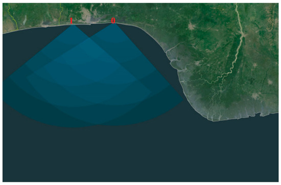 - Two HFSWRs with a nominal range of 80 nautical miles (approximately 150 km) for a Bonn Express class of vessel [21] during night-time and sea states [22] up to 3. For larger vessels and during the day—time range can extend even beyond 125 nautical miles (approximately 230 km). Regardless of the time of day and vessel size, angle coverage is set to 120 degrees. More about used HFSWRs can be found further in the text, while the HFSWR network coverage area is shown in Figure 1.