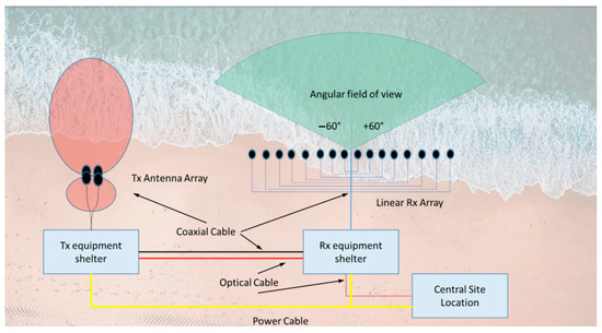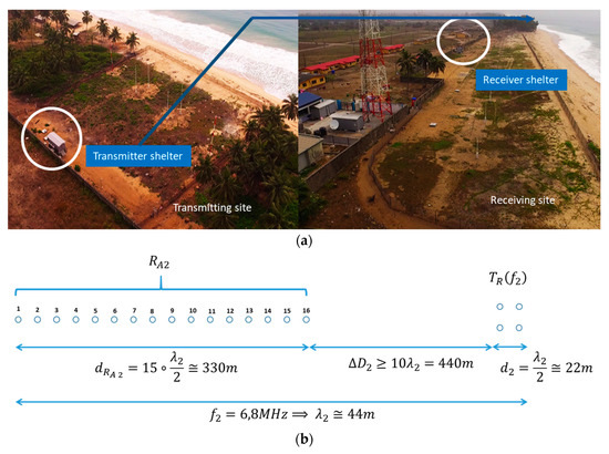 The transmitter array is a planar array consisting of 4 monopole antennas, while the receiving array is a linear array of 16 monopole antennas. It is important to note that the exact measure of the site’s geometry is defined by HFSWR center frequency since antenna spacing is roughly half of the wavelength (λ/2), while the transmitter and receiver’s mutual distance, with their antenna arrays, is 10λ. For example, if the center frequency is chosen to be 6.8 MHz, the wavelength is approximately 44 m, which corresponds to having a receiver site length of over 300 m and a mutual distance between sites of at least 440 m. A picture of the fully deployed site is shown in Figure 3.