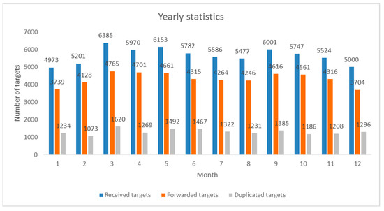 The analysis is presented on a monthly basis starting from the 1st of January 2018 and ending with the 31st of December 2018. During this period, nearly 68,000 single radar tracks were delivered by the HFSWRs in the network. After processing, slightly over 52,000 fused tracks were created, which means that nearly 16,000 radar tracks were eliminated since they were duplicates. In other words, this algorithm removes about 23% of the received radar tracks, thus significantly reducing the false alarm rate. Please take note that Appendix 1 of [25] provides a detailed analyses of HFSWR detection accuracy. There you may find that the typical position measurement error for HFSWR is several hundred meters. This is far too much for any of the commercially available maritime C2 systems. So, without the algorithms presented in [24,25,26], all duplicated targets will cause false tracks in the C2 system. Moreover, comparing results from the data fusion algorithm for the number of obtained targets with the number of targets obtained with individual radars, it becomes clear that the fusion algorithm introduces a detection improvement of 15 to 50% over the single radar. More details about measurements obtained with individual HFSWR radars, data fusion algorithms, and AIS are well described in our previous works [24,25].