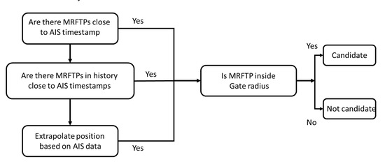 Multi-Radar Fusion Track (MRFT) points, are used for fusion with AIS data, which have their unique identifiers—Maritime Mobile Service Identity (MMSI). Since AIS message dataflow is chaotic, 8 h of deep history records for every MRFT and AIS must be kept. The algorithm is searching for a set of suitable MRFT integration candidates for each AIS data source, as shown in Figure 6. The algorithm checks all currently active MRFTPs to find the ones with a time stamp close to that of the AIS data. If this cannot be achieved, the algorithm tries to load MRFTs from its history in order to find those MRFTPs close to the AIS timestamp. Otherwise, the AIS position is extrapolated from the data provided by AIS under the assumption that the vessel did not change its course and speed. Next, the gate radius needs to be checked. Those MRFTs which pass both checks (timestamp and gate radius) are considered candidates for integration. If MRFT is considered unsuitable for integration N consecutive times, it shall never again be considered for integration with the observed AIS track. Then, for each candidate pair, the matching factor is calculated: the likelihood that the observed pair of data originates from the same vessel. At the end of this step, for every AIS track, MFRT candidates are sorted by their matching factor value.
