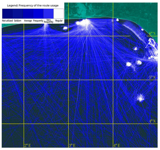In Figure 8, all the routes are represented in shades of blue, stretching from dark blue to white. The brighter the color, the more vessels were using the route. From Figure 8, it can easily be seen that the majority of vessels are centered around large ports such as Lagos in the north of Figure 8, which is not a surprise since Lagos is one of the busiest harbors in Africa. In the eastern portion of Figure 8, an oil-rich area of the Niger River Delta can also be easily noted. This area consists of both inland oil fields, which can be accessed by sea, and offshore oil platforms, which are located in Nigerian territorial waters as well as Nigerian high seas. It is clear that some of the platforms are located far beyond the horizon and thus out of the reach of regular microwave sensors located on land but well inside the coverage area of HFSWRs. The usual routes used by vessels in the area are quite expected and lead straight to the large ports and the oil fields, nothing unusual at first glance.