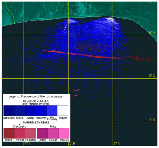 - Vessels detected in HFSWR vicinity: Those vessels are smaller fishing vessels, and despite reflecting a weak echo, they are fairly close to the HFSWR and thus are detected and tracked. Furthermore, there is a development project near the eastern HFSWR with a lot of activity in the area, so more vessels are passing in the coverage area of that HFSWR. In the end, that HFSWR is located between the port of Lagos and the oil fields in the Niger River Delta, and not all vessels passing through the area are utilizing AIS devices, although the majority of them should. All vessels in this area can also be detected with MMR and/or electro-optical systems located on the shore and thus are tracked by more than one sensor type. Henceforth, the trajectories of these vessels are depicted with shades of blue, signalizing that they do not represent a maritime threat. There are other routes that are located further away from the shore and are depicted with shades of blue in Figure 9. In practice, these routes most probably represent the vessels that simply turn off their AIS devices in order to avoid detection by pirates operating in the area since they are following the regular shipping routes. Although this is not completely in accordance with international regulations, it has been a proven tactic to avoid pirate attacks. It is clear that those vessels do not represent any kind of threat but simply try to stay out of trouble.