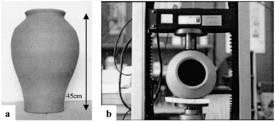 Hein et al. [] investigated the strength of the Koan amphorae from Halasarna; see Figure 3. The authors pointed out that amphorae had to fulfil requirements in terms of mechanical strength and toughness, but also in terms of standardisation of the vessel’s shape and size. The detailed chemical composition of ceramics and clays was determined first. After that, FEM analysis of different amphorae was conducted. Hein et al. [] concluded that the change in the shape of the Koan amphorae led to an improvement in mechanical performance, which is an example of the development of a functional design. Hein et al. [] considered the modulus of elasticity value of 18 GPa, while Radić Rossi et al. [] measured the modulus of elasticity value of 8 GPa according to the standard test procedure DIN 53427.