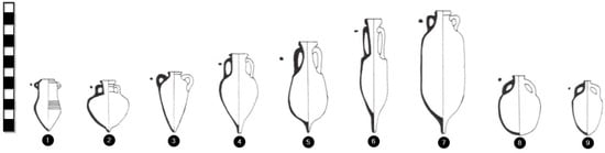 A chronological selection of amphora shapes: (1) Phoenician amphora, 7th century BC; (2) Corinthian amphora, 6th–2nd century BC; (3) Etruscan Py 3B amphora, 6th century BC; (4) Graeco-Italic amphora, 4th–3rd century BC; (5) Italic Lamboglia 2 amphora, 1st century BC; (6) Italic Dressel 1b amphora, 2nd–1st century BC; (7) North African Africana Grande (I) amphora, 2nd–5th century AD; (8) Aegean Late Roman 2 amphora, 4th–7th century AD; (9) East Mediterranean Late Roman 1 amphora, 5th–7th century AD; reprinted from [], courtesy of the authors, 2023.