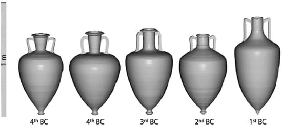 Another pioneering work related to the strength of the amphorae is the consideration of the origin and function of the amphora’s spike conducted by Radić Rossi et al. []. Many types of amphorae have a prominent spike at the bottom of the body. It is useful when the amphorae are placed in sand, soil, a bed of branches or another suitable substrate that makes their arrangement more stable. At the same time, the spike seems inconvenient in other cases, such as handling a single amphora, when it has to be left somewhere in an upright position. On the other hand, there are many amphorae with no prominent spike or no spike at all. Therefore, the question arises: what is the purpose of the amphora spike in the context of an amphora’s strength? The chronological selection of amphora shapes is shown in Figure 2. The simplified evolution line shows an increase in size accompanied by an increase in the spike. The reduction in size in Late Antiquity and the Early Mediaeval periods again resulted in the elimination of the spike while retaining the rounded or conical bottom.