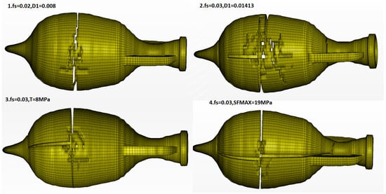 Recently, Sviličić et al. [] performed a sophisticated numerical non-linear FEM analysis to determine amphora resistance to ruptures and cracks. The LS-DYNA software package (version R11.1) was used for the calculation, and the Johnson–Holmquist material model was chosen for damage modeling. Since the parameters of the material models were not readily available, a sensitivity analysis was first performed to determine their most appropriate values (Figure 5).
