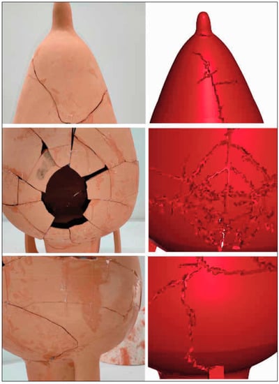Three different amphorae were taken for a free-fall drop test from different heights. Finite element models of the same amphorae were generated, and a simulation of the crush test was carried out with the correct physical constraints: gravity, drop height, ceramics material properties, etc. The results of experiments and numerical simulation were compared, as shown in Figure 6.