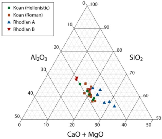 - Hein, A.; Georgopoulou, V.; Nodarou, E.; Kilikoglou, V. Koan Amphorae from Halasarna—Investigations in a Hellenistic Amphora Production Centre. J. Archaeol. Sci. 2008, 35, 1049–1061. [Google Scholar] [CrossRef]