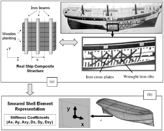 Composite iron–wood ship structure (a) and its modeling through shells with smeared properties (b); reprinted from [], copyright (2010), with permission from Elsevier.