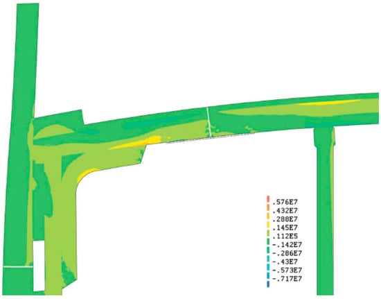 Contour plot of the stresses σ0 parallel to the wood fibres, in the cut area of the upper deck beam (colour figure available online); reprinted from [], copyright (2012), with permission from Taylor & Francis.