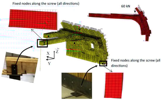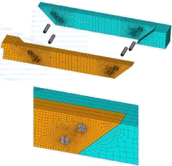 Arciszewska-Kedzior et al. [] conducted an experimental and numerical analysis of the lapped scarf joint. Such a joint was commonly used to repair damaged beams in historic structures. The numerical model of the lapped scarf joint is shown in Figure 12.