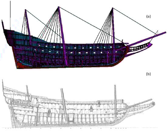 Afshar et al. [] extended the study and conducted full-scale finite element modeling and analysis of the warship Vasa. The methodological approach and preliminary results were presented. The FEM model of the Vasa and a drawing of the longitudinal cross-section are shown in Figure 14. Prior to generating the geometry of the FEM model, a CAD model was created that required considerable effort, not only in the modeling process but also for onboard measurements. The purpose of the analysis was to capture the ship’s response to current and potential future support solutions. ANSYS software was used for the analysis.