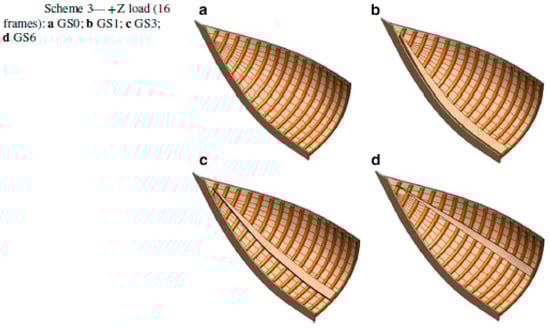 Additional details about the aforementioned analysis are provided in the following paper by Helfman et al. []. Here, three critical interdependent factors are studied: the number of transverse frames, the number of longitudinal reinforcements and their relative location. Three main ship hull reinforcement schemes were examined and the corresponding rigidity was determined, as shown in Figure 16. It has been shown that the insertion of longitudinal reinforcements contributes to the structural integrity of a frame-based hull, reducing the von Mises stress in all experimental load regimes.