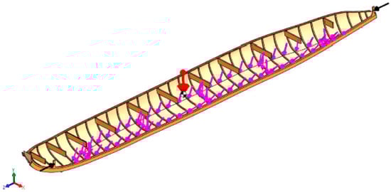 Payload distribution and hypozomata tension vectors (authors’ CAD depiction); reprinted from; Arrows indicate load applied: red for the light ship weight, pink for the distributed weight of man, cargo and equipment and black for horizontal hypozomata tension [], copyright (2022), with permission from Taylor & Francis.