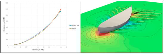 Comparison of the results of calculation of resistance to still water using the Holtrop method and CFD analysis of the original hull form (left) and a perspective view of CFD simulation of resistance to still water with surface elevation (right). Colors indicate surface wave elevation; reprinted from [], courtesy of the authors, 2023.