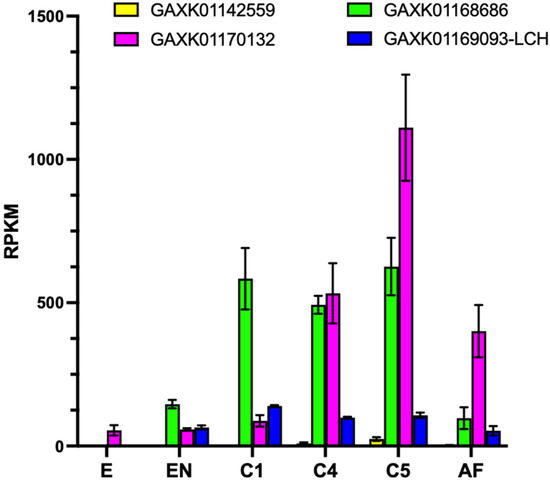 Relative expression of ferritin transcripts in C. finmarchicus across development. Relative expression normalized by length (RPKM) across six developmental stages: embryos, early nauplii (NII-NIII), copepodites I, IV and V (C1, C4 and C5), and adult females (AF). Bars are mean ± standard deviation (n = 3 replicates, n = 2 C1 and C4). Colors indicate different transcripts and their NCBI accession number.