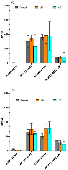 No significant differences were found in the expression of all ferritins in C. finmarchicus females feeding for two days on the toxic Alexandrium fundyense at different concentrations (low and high dose) compared to control conditions (Figure 3a,b). However, in spite of treatments and time points, the expression of the different transcripts was significantly different (two-way ANOVA, p < 0.0001). At two days, similarly to the previous dataset, two transcripts showed a null or very low expression in all treatments, whereas the transcripts GAXK01168686 and GAXK01170132 were significantly more abundant (average 300 RPKM) compared to the other two (Tukey’s multiple comparison test, p < 0.001) (Figure 3a). The same results were observed after five days of exposure, with the same two transcripts (GAXK01168686 and GAXK01170132) being significantly highly expressed in all conditions compared with the other two (Tukey’s multiple comparison test, p < 0.001) (Figure 3b).