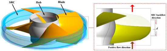 The calculation model of the BFFP unit consists of impeller, stator and rotor clearance (SRC), inlet guide vane (IGV), guide vane (GV), GV diffusion section, and inlet and outlet water channels. The SZM35 hydraulic model is used for the impeller and GV of the BFFP, and Figure 1 shows the two-dimensional parameter diagram of the SZM35 impeller model. The impeller hub diameter D1 is 120 mm. The impeller shroud diameter D is 300 mm. The number of impeller, GV and IGV blades are four, six and five, respectively. The impeller speed n is 1421 r/min. The thickness d of the SRC is 1 mm. The design flow rate is Qd = 297.3 L/s. Figure 2 display 3D model of the impeller “SZM35” and its internal flow diagram.