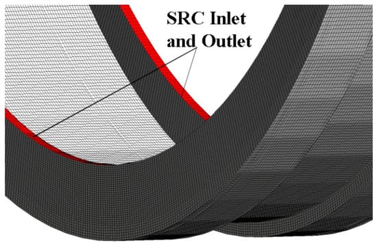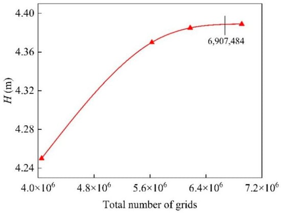 In order to increase the speed and accuracy of the calculations, structured grids were used for all parts of the pump unit. As the number of grids affects the convergence and accuracy of the simulation, a grid-independent analysis was performed for the BFFP model. The variations of the head with the number of grids are displayed in Figure 3. Figure 3 shows that once the number of grids reaches 6.17 million, increasing the number of grids has little effect on the head. Therefore, taking into account the calculation time, the total number of grids was determined to be 6.91 million. The grid information for each part of the pump unit is shown in Table 1. A computational model of the pump unit and the grids of each part are shown in Figure 4. The detailed grids of the SRC and impeller are shown in Figure 5 and Figure 6.