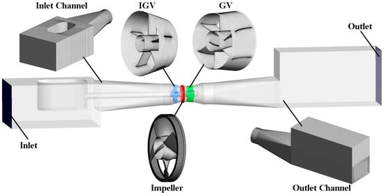 Unlike the structure of the axial flow pump, the full-flow pump (FFP) integrates the motor with the outer edge of the impeller and does not need to be driven by a drive shaft. Its flow channel also does not need to be designed in a curved shape and has a simple structure, so it is widely used in areas such as low-head pump stations and circulating cooling pumps. Shi et al. [,,] showed that the clearance reflux of FFP leads to a lower performance than axial pump. When at a small flow rate, the pressure pulsation (PP) of the FFP is smaller compared with the axial-flow pump. The BFFP in this paper combines the advantages of FFP and “S” airfoil-type, so it is meaningful to study it.