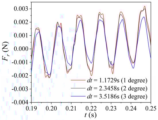 The size of the time step had an impact on the computational accuracy, and a time-step independent analysis of the device was performed, as shown in Figure 7. The results in Figure 7 show that the calculation results become more accurate as the value of the time step decreases. However, the difference between the results for time steps of 2.3458 × 10−4 s and 1.1729 × 10−4 s is smaller. Finally, the time step of 2.3458 × 10−4 s (i.e., the time used to rotate the impeller by two degrees) was chosen with reference to the study of Zhang et al. [], Mu et al. [] and Jin et al. [] and the limitation of computational resources. The total time t is 0.5911 s, which is the time for 14 rotations of the impeller.