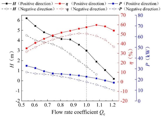 In order to investigate the difference in performance of BFFP during the positive and negative operation, numerical simulations of the pump unit were performed. The head H, efficiency η and shaft power P of the pump unit were taken out for comparison, as shown in Figure 8. It can be found that when the flow rate increases, the efficiency first increases and then decreases, and the head and shaft power gradually decrease. The external characteristics of the BFFP have the same tendency in positive and negative operation. The head, efficiency and shaft power of the BFFP are significantly higher than those of the negative operation when it is running in the positive direction. The maximum efficiency of the unit is 59.74% in the positive operation and 52.89% in the negative operation. The difference in efficiency is about 6.85%. Under the design condition, the head difference in the two directions is about 1.46 m, and the efficiency difference is about 4.92%. Under the design condition, the shaft power difference is about 4.94 kW. Compared with the positive running condition, the performance curve of the unit shifted about 40 kg/s to the low flow rate in the negative running condition.