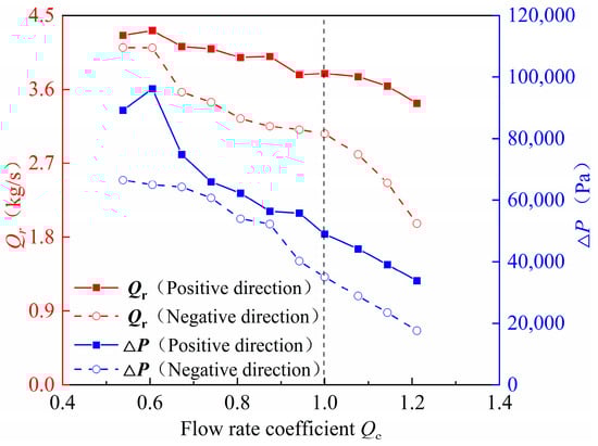 The difference in performance between the positive and negative operation of BFFP is obvious. The performance when running in the negative direction is significantly worse than the performance when running in the positive direction. In order to investigate the reason for the performance difference, the pressure difference (PD) ΔP between the inlet and outlet of the impeller, SRC reflux flow coefficient Qr of the BFFP are taken out for analysis. The results in Figure 9 show that the Qr and ΔP of the BFFP gradually decrease when the flow rate increases. The Qr and ΔP are significantly smaller in the negative operation compared with the positive operation. When the BFFP is operating under the design conditions, the Qr is approximately 3.79 kg/s in the positive direction and approximately 3.06 kg/s in the negative direction. The difference between the Qr of the two operating conditions is approximately 0.74 kg/s.