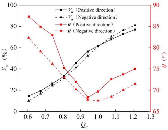 Since the performance of the pump unit is obviously influenced by the pattern of flow, the reason for the difference in performance between the two operating directions of the pump could be found by analyzing the flow pattern of the impeller inlet. The inlet conditions of the impeller can be judged from the two parts of flow uniformity Vu (FU) and velocity-weighted average angle θ (VAA). Figure 10 shows the comparison of FU and VAA for the pump impeller inlet. From the figure, it can be found that in both operating directions, the FU and VAA have the same changing trend. When the flow rate increases, the FU gradually increases, while the VAA first decreases and then increases. In the positive operation, the water enters the impeller at a higher velocity-weighted average angle after passing through the inlet guide vane because the inlet guide vane is the straight vane type. In the negative operation, due to the diffused shape of the rear guide vane, the water passes through the rear guide vane with a pre-swirl and therefore enters the impeller at a lower velocity-weighted average angle than in the positive operation. Similarly, at low flow rates and design conditions, the velocity uniformity at the impeller inlet is slightly better in the positive operation than in the negative operation. In summary, the inlet conditions at the impeller inlet are better in positive operation than in the negative operation for the BFFP, which is one of the reasons why the positive performance of the pump is better than the negative performance.