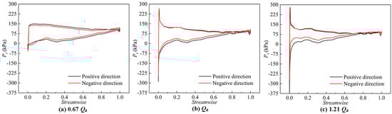 The work capacity of the impeller is influenced by factors such as the shape of the blades and the inlet water flow pattern, so the pressure distribution on the surface of the blades of the BFFP can be studied. Figure 11 shows the pressure distribution Ps on the surface of the blade at a span equal to 0.9. Steamwise equal to 0 means at the head of the blade. Steamwise equal to 1 means at the tail of the blade. It can be found that the PD at the head of the blade is much larger than at the tail. As the flow rate increases, the PD between the pressure side (PS) and the suction side (SS) of the blade becomes smaller and smaller. When at a 0.67 Qd operating condition, the pressure distribution on the PS is larger in the positive operation than in the negative operation, and the pressure distribution on the suction side is smaller in the positive operation than in the negative operation. In design- and high-flow conditions, the difference in pressure distribution on the PS of the blades is small, and the pressure on the SS of the blades is significantly smaller in the positive than in the negative operation. In the negative operation, the PD between the PS and the SS of the blade is distinctly smaller than that in the positive operation. This is the fundamental reason why the positive performance of the BFFP unit is better than the negative performance.