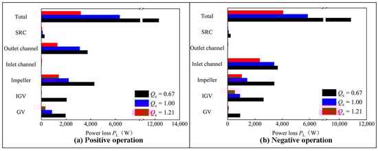 In order to visualize the flow instability region inside the unit and to visualize the energy loss, the EPR inside the pump unit is calculated. Figure 15 shows the EP of each component of the pump unit for three operating conditions. Figure 16 shows the EPR distribution in the pump unit for both directions of operation. The EPR distribution of the SRC, impeller, GV and IGV profiles are selected for demonstration, respectively.