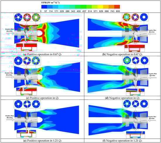The total EPR of the BFFP is about 1.27 times, 1.13 times and 1.08 times higher in the positive operation than in the negative operation at 0.67 Qd, Qd and 1.21 Qd flow rates. In particular, the difference in EPR between two running directions at 0.67 Qd operating condition is greater, resulting in a significantly lower performance of the pump in negative running than in positive running. When at the Qd operating condition, the EPR of the impeller in the positive operation accounts for about 35% of the total EPR, while the EPR of the impeller chamber in the negative operation accounts for about 58% of the total EPR, which shows that the energy exchange inside the impeller in the negative operation is more obvious.