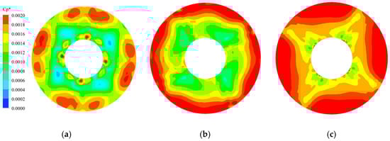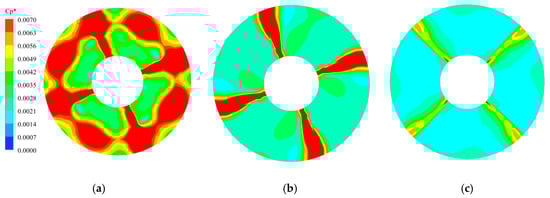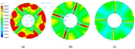 Before studying the PP of the BFFP, two dimensionless parameters, PP coefficient CP and PP intensity (PPI) CP*, are introduced to enhance the comparability between the data [,,,]. The PPI is determined in CFD-POST using the standard deviation algorithm, which is defined according to a statistical approach and is a dimensionless parameter. The PPI represents a composite measure of the resultant over one cycle at the network interface, independent of the specific instantaneous rotational position at which the impeller is located. The concept of PPI, therefore, provides a comprehensive and accurate quantitative analysis of the non-stationary flow phenomena in the inlet and outlet sections of the impeller. The equations for PP coefficient and PPI, respectively, are