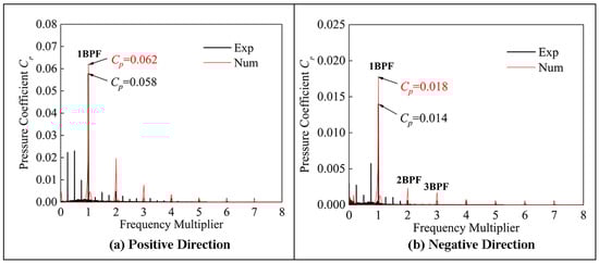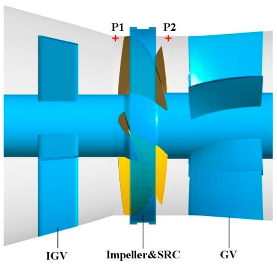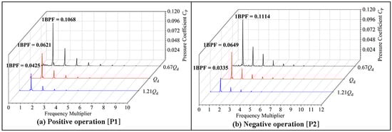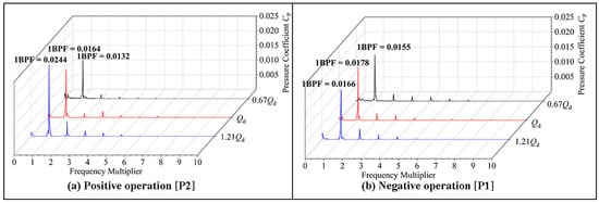The PP of the BFFP is concentrated in two positions of the impeller inlet and outlet for research, where P1 is placed in the middle of the IGV and impeller, and P2 is placed in the middle of the impeller and GV, as shown in Figure 22. Figure 23 and Figure 24 show that the primary frequency of PP at the impeller inlet and outlet is BPF regardless of whether the BFFP is operating in a positive or negative direction. The amplitude of PP at the impeller inlet is greater than that at the impeller outlet. In the design condition, the primary frequency of PP at the impeller inlet in the positive and negative operation is 3.01 and 3.65 times that at the impeller outlet, respectively. The difference of the PP amplitude between impeller inlet and outlet in the negative operation is larger. At a high flow rate, the amplitude of PP at the impeller inlet and outlet during negative operation is smaller than that during the positive operation. In the other two flow rates, in the pump in a negative operation, the impeller inlet and outlet PP amplitude are greater than the positive operation.