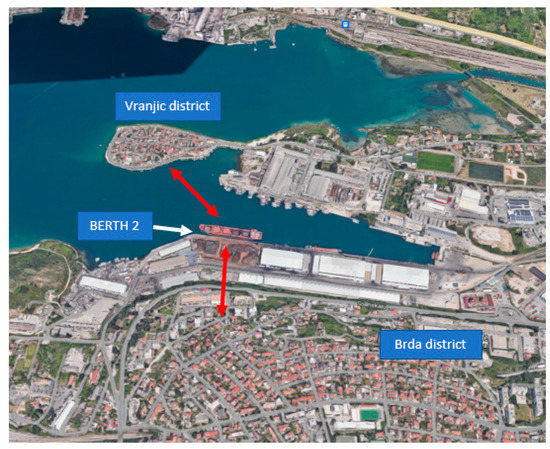 The most common berthing practice considers berthing the vessel alongside, with the port side to the quay wall. In addition, the distances in the considered populated areas were defined as the nearest points between each road and berth 2. The results are shown in Figure 6.