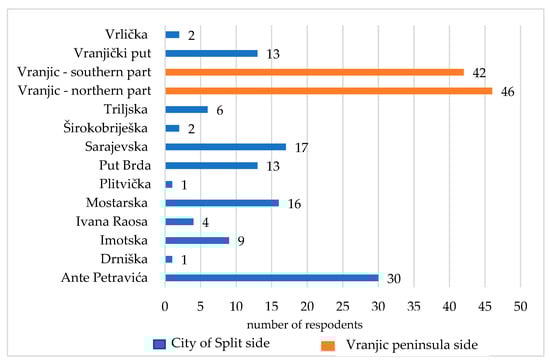 The breakdown of the locations of the residences, according to residential street, is indicated in Figure 2. The streets located in the Brda district, Ante Petravića and Vranjički put, and the southern part of the Vranjic peninsula are the areas closest to the cargo terminal.