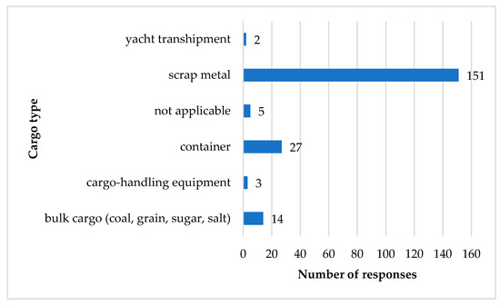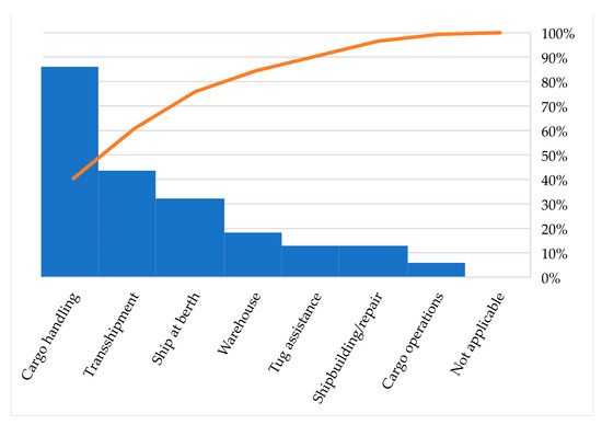 The majority of respondents indicated that the characteristic of excessive noise pollution was continuous, so it occurred throughout the time the ship was at berth and the handling activities were carried out. In addition, the dominance of excessive noise pollution during night hours was highlighted. Respondents also estimated the type of operation that contributed the most to noise pollution from cargo terminals in the Port of Split, as shown in the Pareto diagram (Figure 3). The analysis showed that cargo handling operations, ship at berth (auxiliary engines, ventilation), and transshipment cargo operations to truck/train had the dominant impact as noise sources, generating a harmful impact on the residents in the vicinity of the cargo terminals.