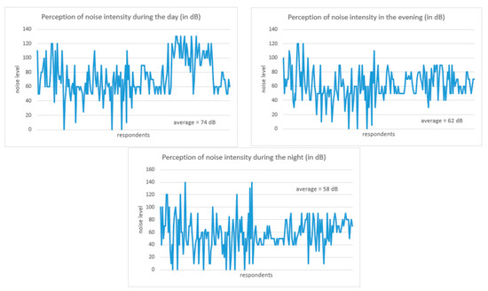 The core part of the survey concerned the assessment of residents’ perceptions of the intensity (dB) of noise from the cargo terminals at their place of resident during the day (7–19 h), evening (19–23 h), and night (23–7 h). The variation of the trend in individual responses is provided in Figure 5.