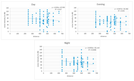 Dependence of the assessed noise intensity (dB) on the distance of individual residences, for three different times of the day (day, evening, and night).